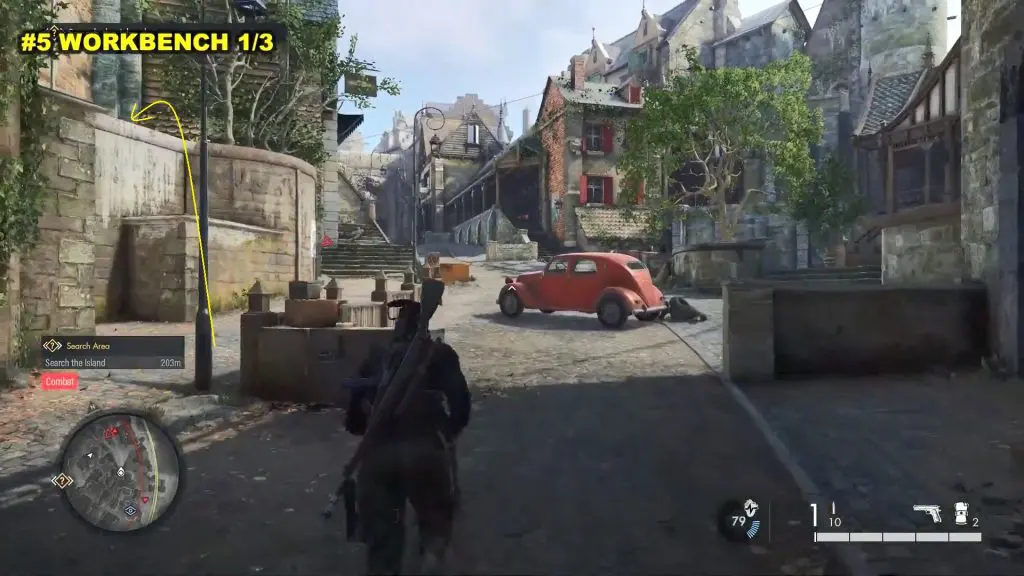Go north beyond the statue and pass through the archway. Enter into the building just after the archway on the left. Inside you will find Workbench 1: SMG Workbench