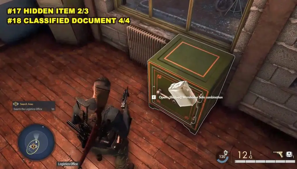 Head to the upper section of the shipping warehouse to find the classified documents. You can loot the safe key from an nearby officer or blow the door open with Satchel Charges.