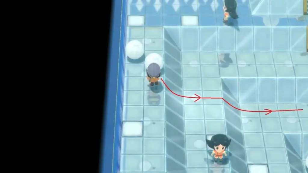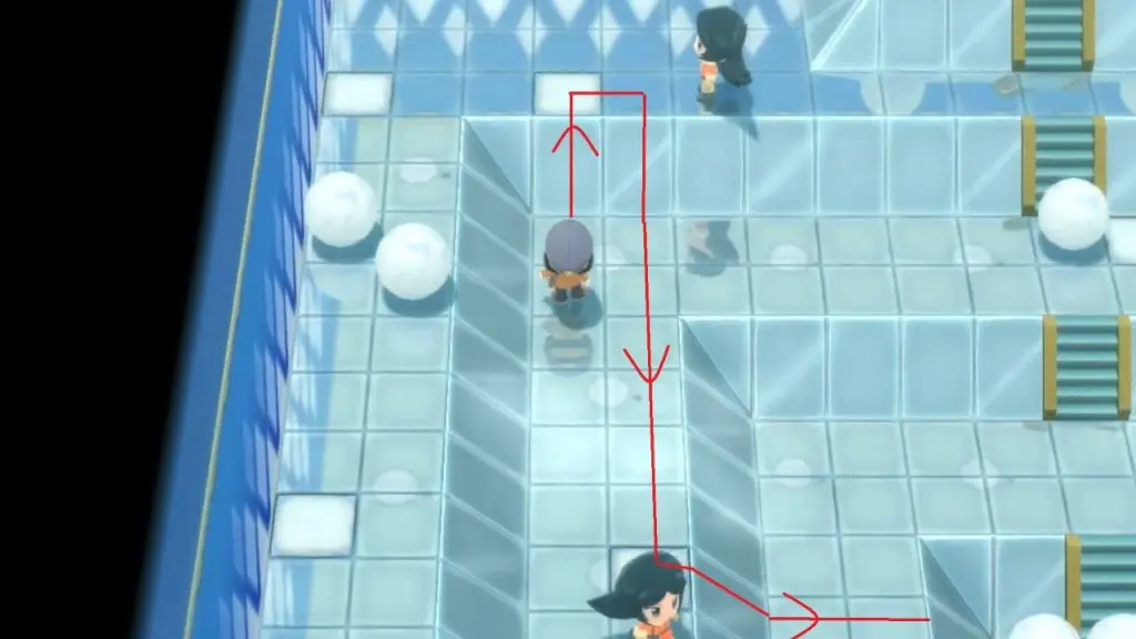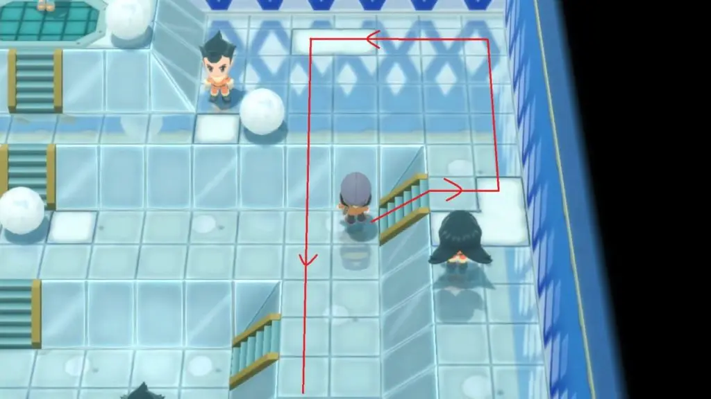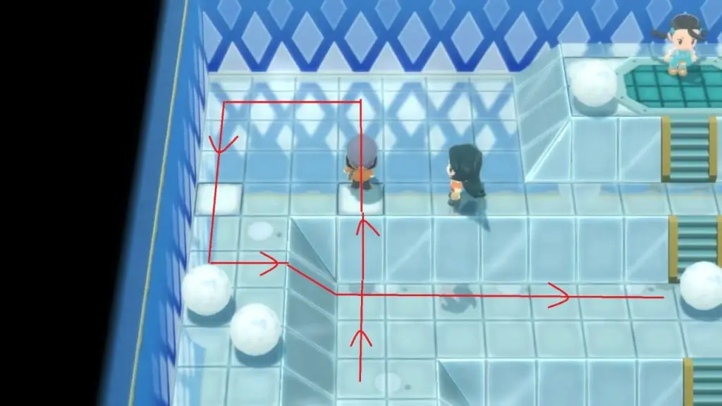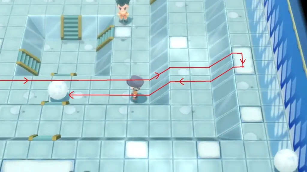 - Here you will destroy one of the snowballs blocking the stairs to the gym’s leader.