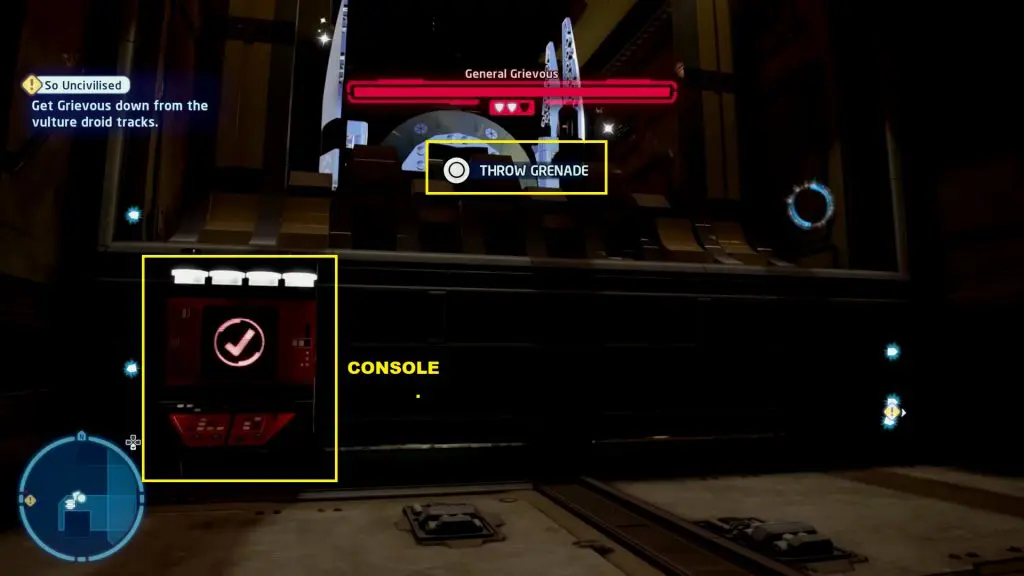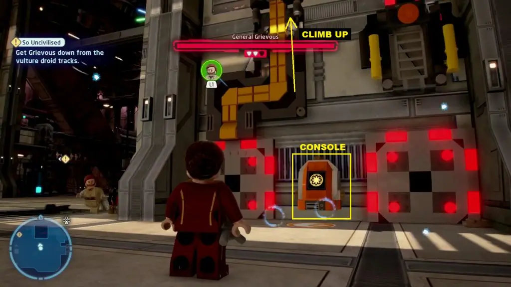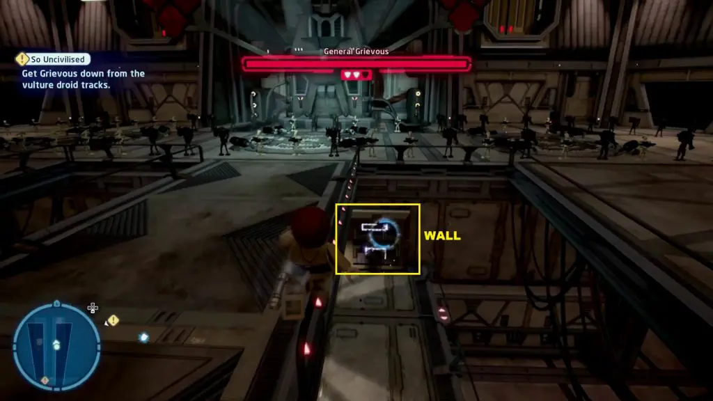 Sneak Attack: When General Grievous climbs to the top platform, go to the platform where you got Minikit #2. From there, continue ahead and turn right. Destroy the golden brick using a Bounty Hunter character as shown in the picture below. Then climb up the ladder that the golden brick was blocking. This will take you to the platform where General Grievous is. Catch his off-guard to complete the challenge.
