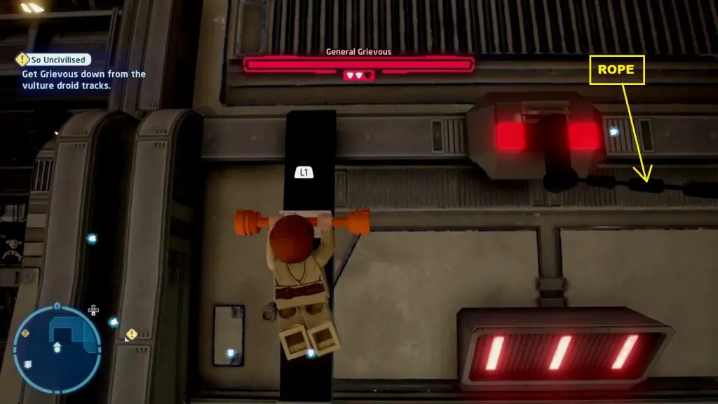 On the wall opposite the turret, you will find a Rebel Command Console. Use a Rebel character and solve the console puzzle. This will make a platform appear from the wall. Climb up the platform and then use a Jedi character to climb up the scratched wall as shown below. Climb to the to and then jump on the rods to reach further above. Then jump to the rope on the right side as shown in the second picture below. This rope will take you to the platform with the Minikit.