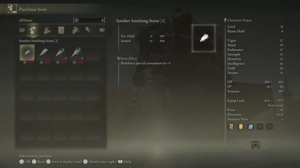 Somber Smithing stone is required to strengthen legendary armaments. There is a total of 10 tiers of Somber Smithing Stones in the game. Tier of a Somber Smithing Stone is represented by a number within the brackets in front of its name. A particular tier Somber Smithing Stone is required based on the level of the gear you want to upgrade. For example, to upgrade a level 6 arnament to level 7, you will need Somber Smithing Stone [7]. This guide shows the location of a vendor who sells Somber Smithing Stone [1], Somber Smithing Stone [2], Somber Smithing Stone [3], and Somber Smithing Stone [4].