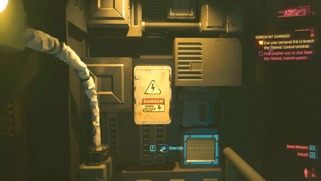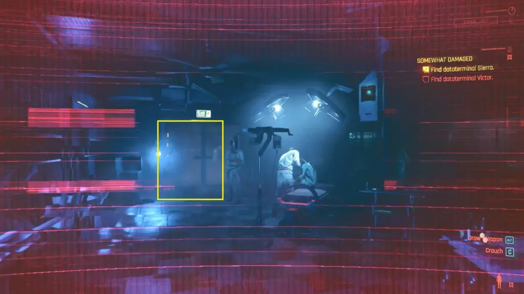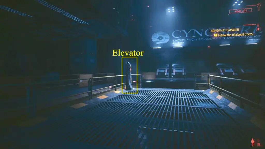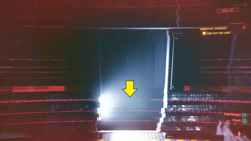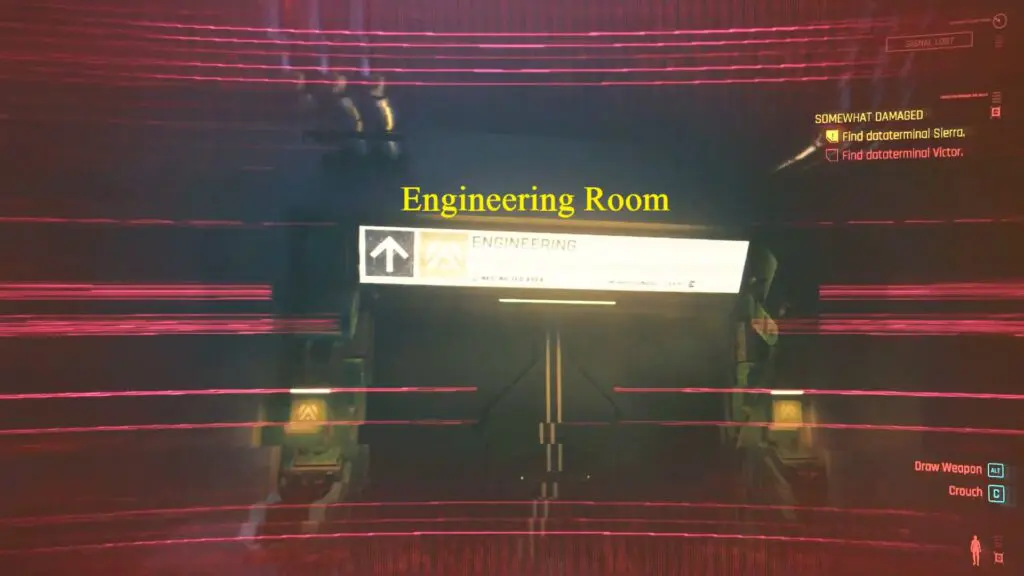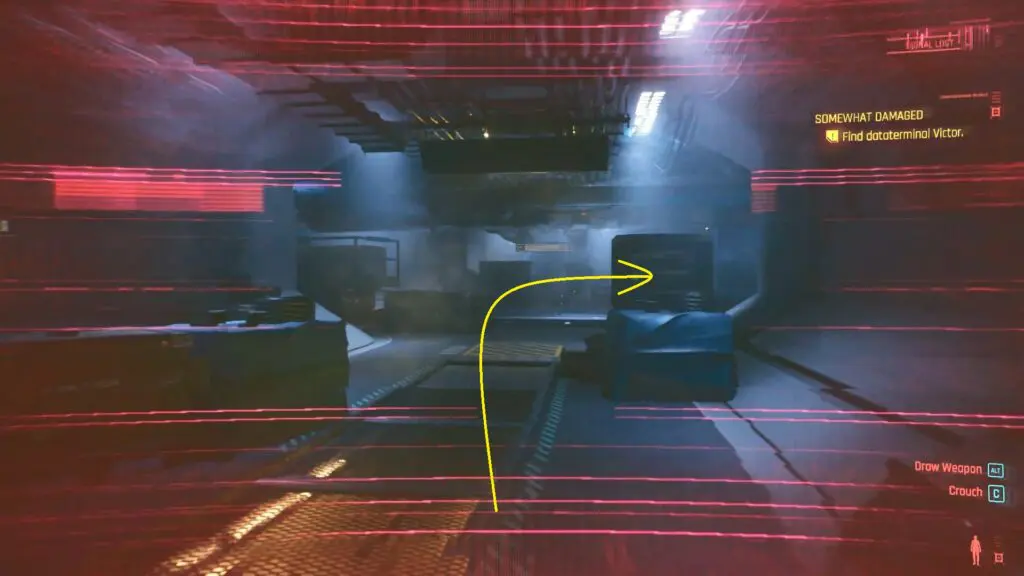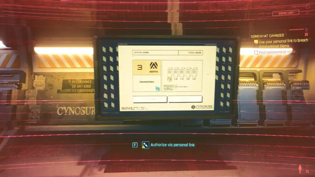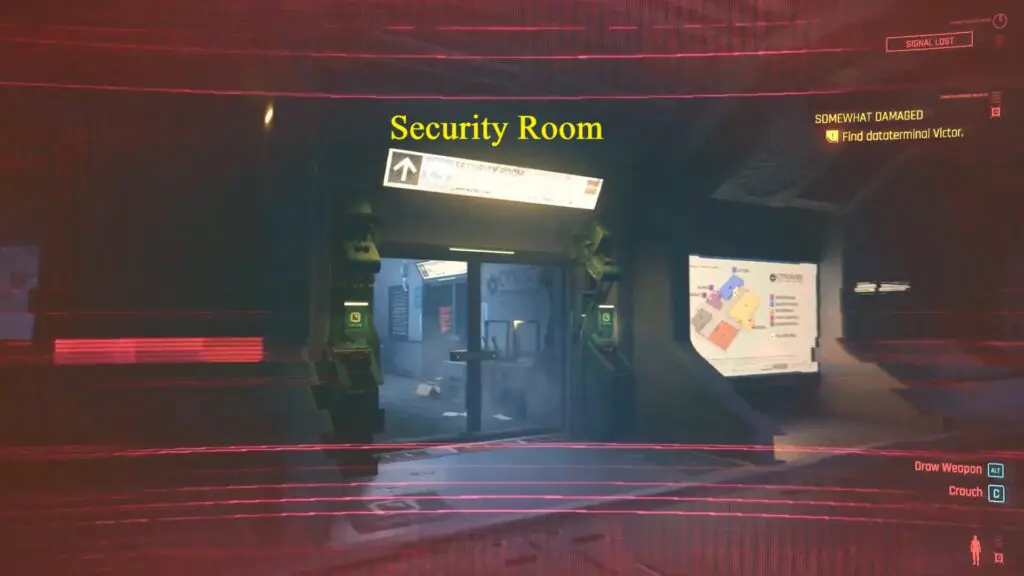 Enter the door “Server Room” to the left side of the corridor and interact with the terminal. You’ll be kicked out as the user is not recognized. Then access it again using V’s personal link and enter the code as shown on the screen to disable dataterminal Alpha. Once it’s done, a trapdoor will open behind you. Jump down and continue forward.