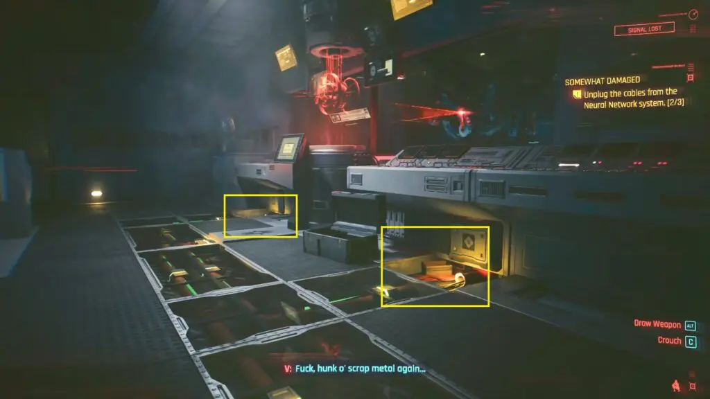Keep moving forward until you reach the next terminal. Upon examination, it becomes clear that this terminal can’t be accessed in the same manner. Crouch down and crawl beneath it to disconnect the cable.