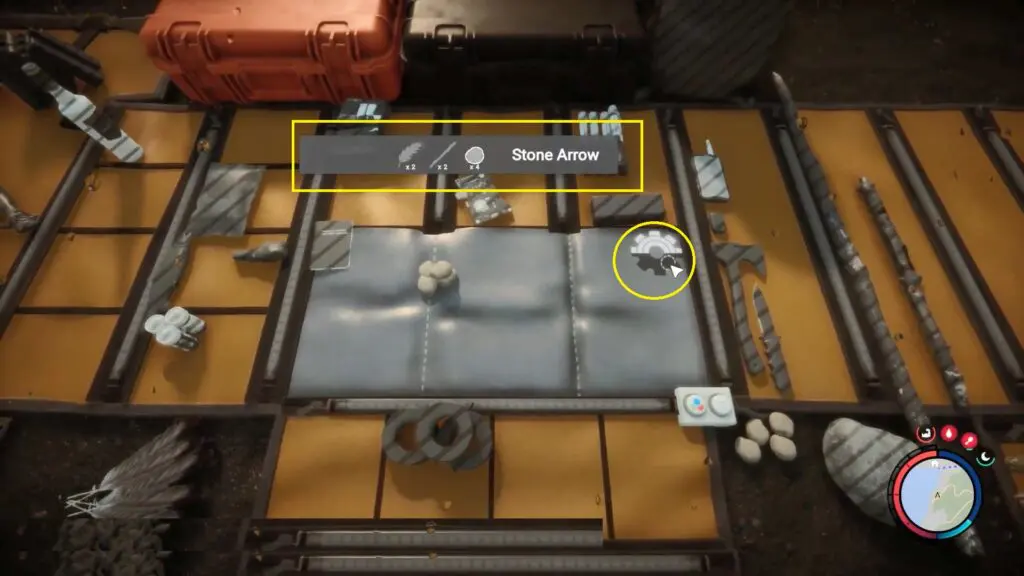 After acquiring the necessary items, open your inventory and right-click on 2 Feathers, 2 Sticks, and 4 Small Rocks. Then, select the cogwheel icon to craft the arrow.