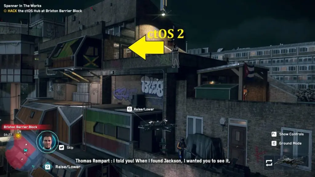 ctOS servers #1: To find the location of the server, hack the lock of the main gates. It will display the ctOS server location on the top of the left building. Launch the multidrone to reach the CtOS server location and disable it. At this moment you will find Jackson is captured by Mr. Rempart.