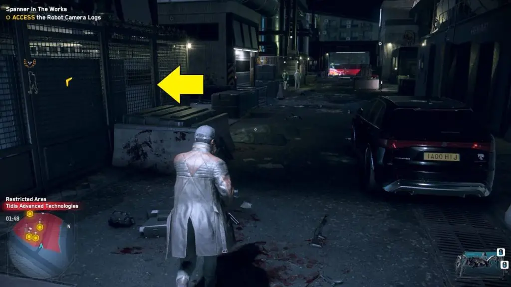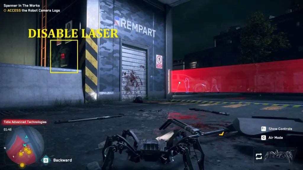 Your objective is to infiltrate Tidis Advance Technologies (Rempart facility). This Rempart facility is located in the Southwark district’s south-west corner. First, proceed to the facility’s south gate, which is secured by a laser. To disable the laser, launch your multidrone and fly it inside. The laser lock is located directly behind the main gate.