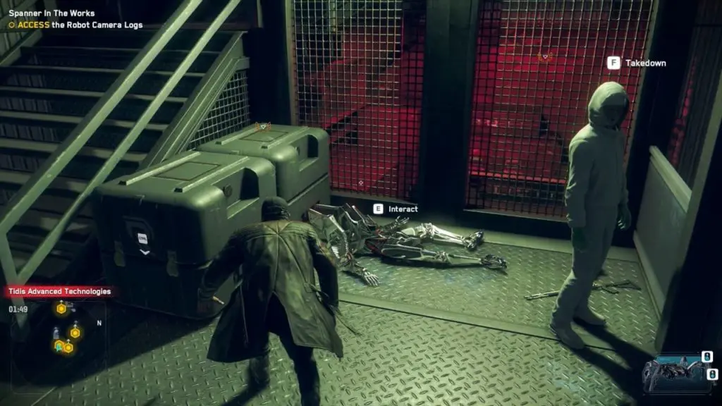 As the laser on the main gate is disabled, you can now sneak inside the facility to check Camera logs. Head inside the first building on the left and analyze the dead robot lying on the stairs.