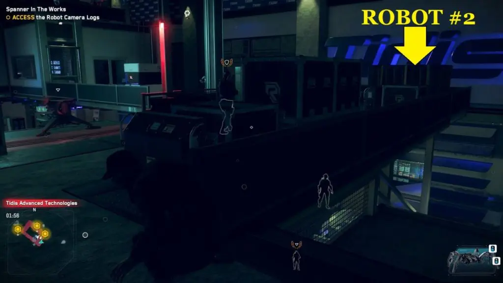 Go to the third floor and neutralize three guards with a melee strike. Analyze the dead robot lying behind the big boxes on the right. You will find nothing as that data has been erased. Now head back to the second floor and neutralize the guard without raising an alarm before investigating the third robot.