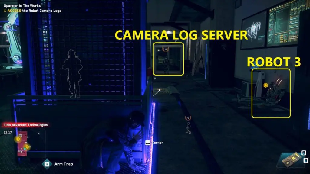 Go to the Camera Log Server to analyze the logs. Here you will find yourself getting tripped by Wrench and get locked inside the server room.