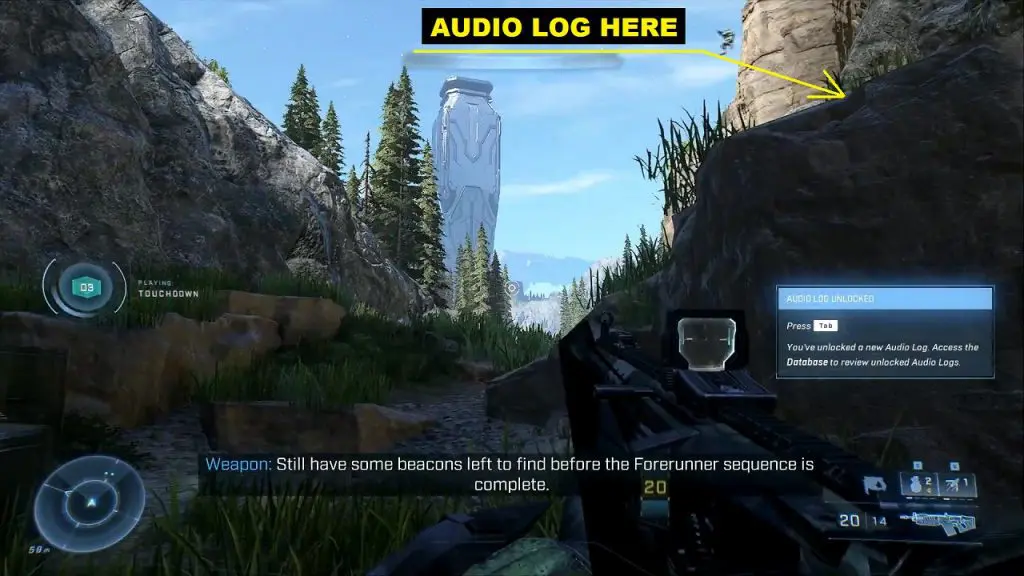This audio log is at the mountain peak east of Pelican Down as shown in the picture below.