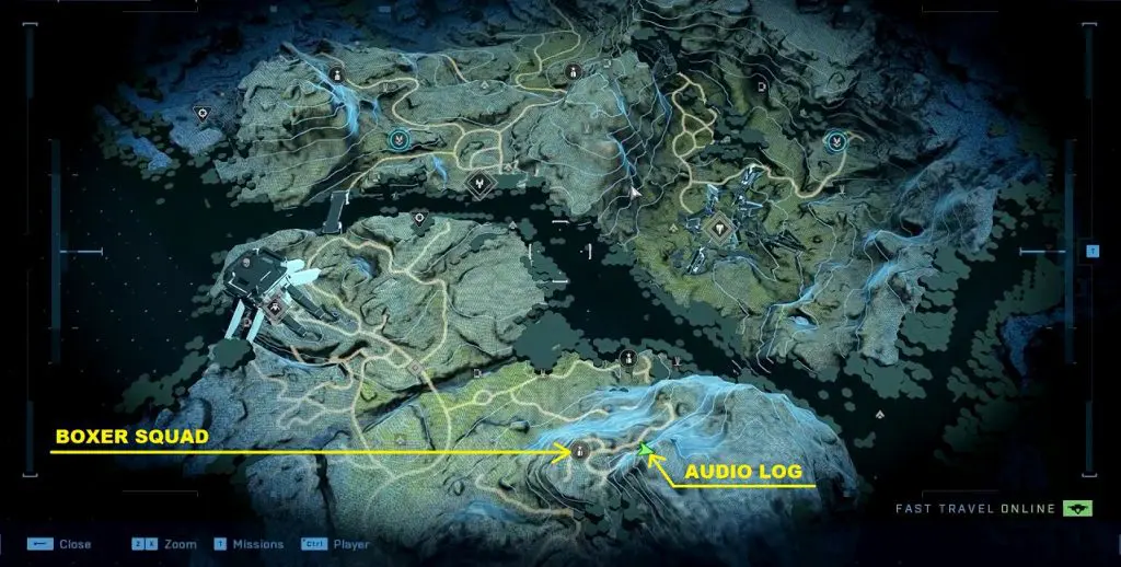 This one is east of Boxer Squad, which is north of FOB Golf. Take the path east of the Boxer Squad. Go along the tallest mountain wall as shown in the pictures below. This path will lead you to a campground, where you will find the audio log.