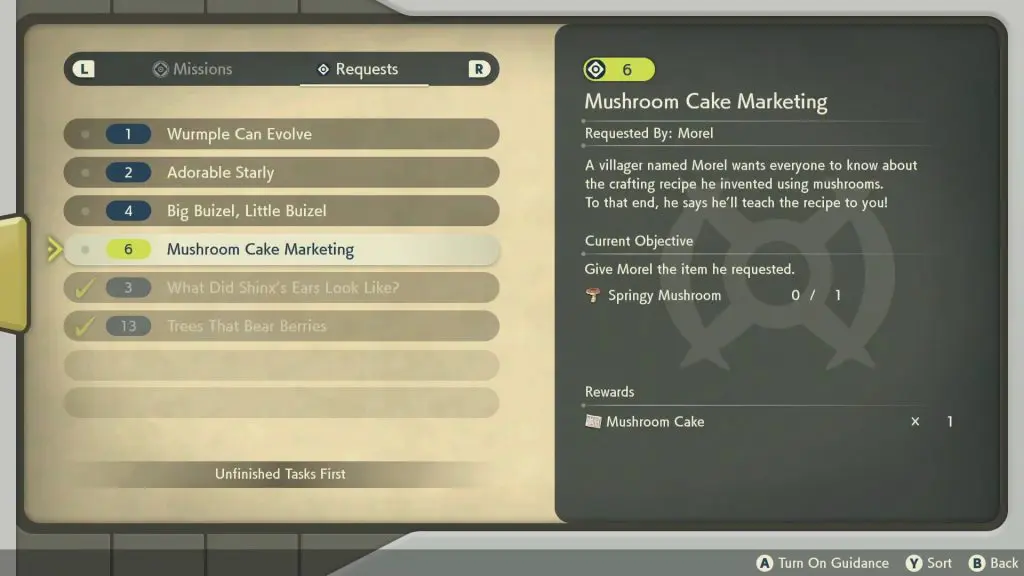 This guide shows the complete walkthrough of “Request 6: Mushroom Cake Marketing” in Pokemon Legends Arceus. For this request, you will need to find Springy Mushroom. There are several ways to get Springy Mushroom. This guide will show 2 locations where you will find Springy Mushroom.