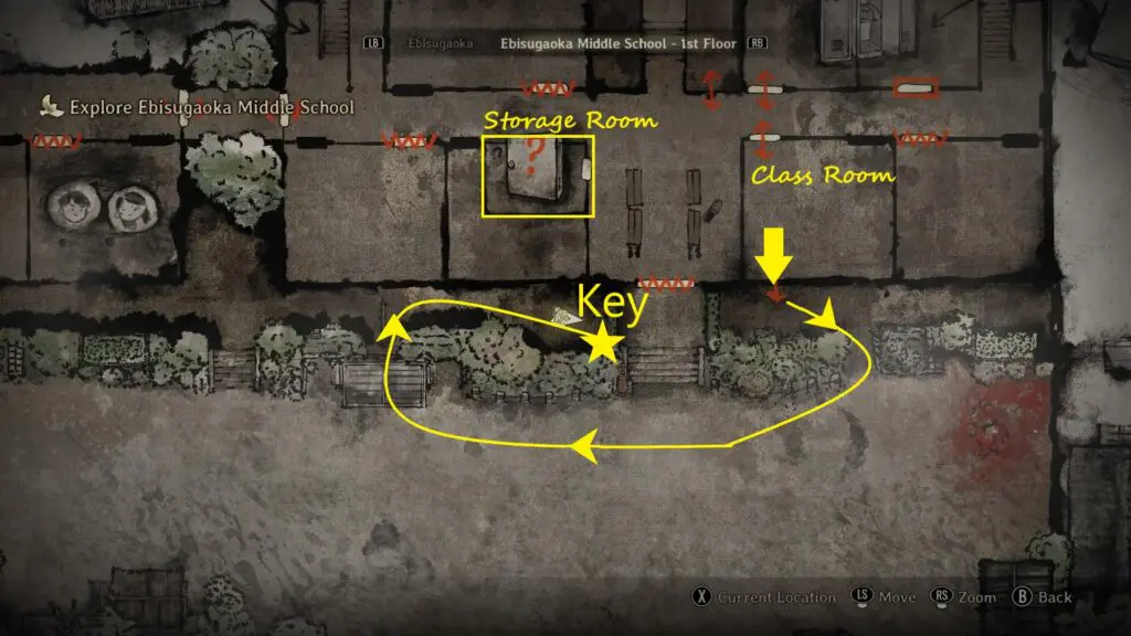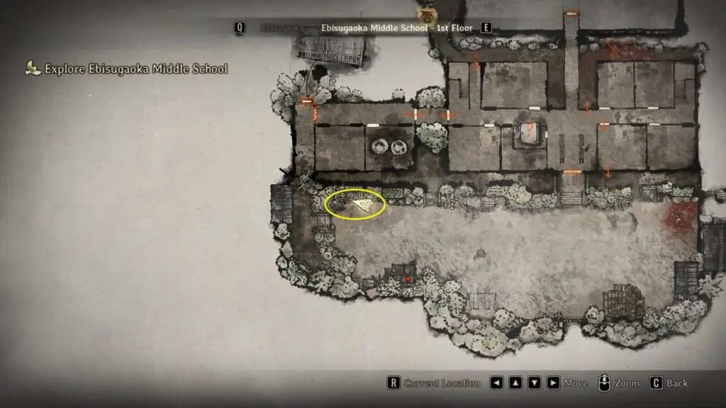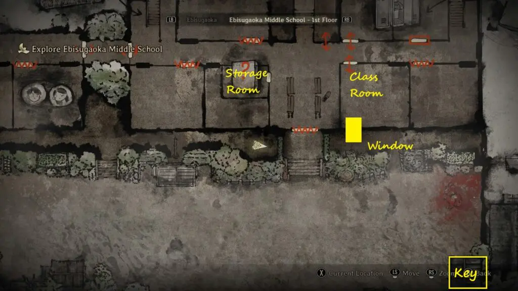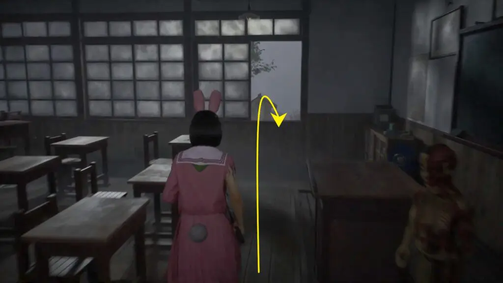Start by looking at the clue, head into the only open classroom, and pick up the crumpled paper from the floor. This note hints that the drawer can be opened using a hairpin. From there, climb out the classroom window and crawl through the small opening in the corner of the courtyard area.