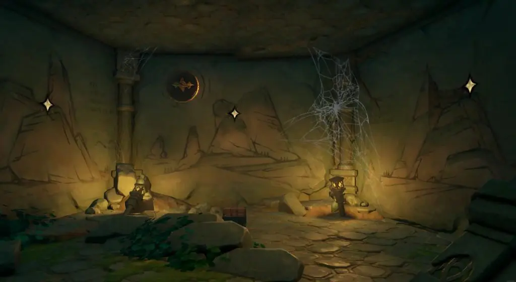 On the wall in front of the door, you will see another Thunderbird picture as shown below. Use the ‘Peculiar Pinion‘ gadget while standing in front of the wall. This will make the wall disappear, revealing a secret room. Go inside the room and open the exquisite chest inside to get a Star-Shaped Gem.