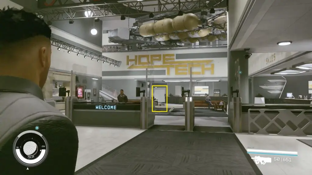 When you arrive at HopeTown, Continue straight from the landing site and enter HopeTech through the door on your right.