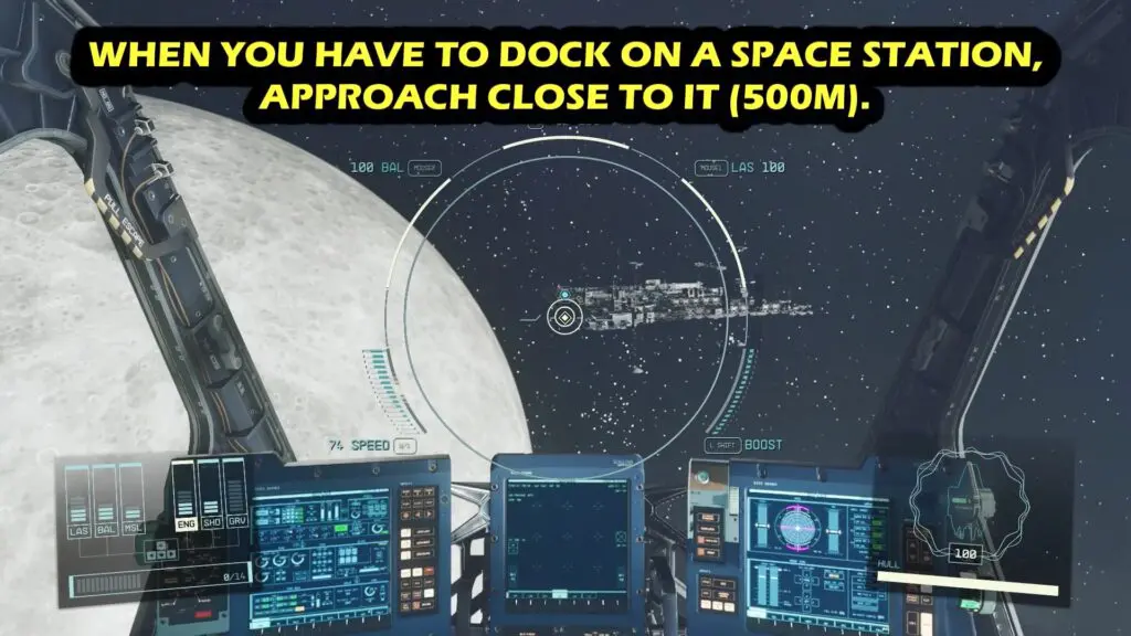 Start moving toward the target ship and make sure your speed isn’t too fast or you can stop it once you reach near it. When you come near enough to the Target ship/space station around 500m or less, you’ll be able to see the “Dock” prompt on the screen. Press button R to dock successfully.
