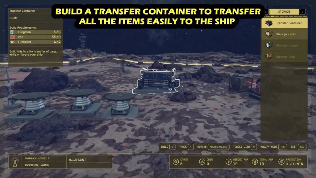 To begin this process, players must first deploy an Outpost Beacon on a planet. Then gather four Lubricants, five Tungsten, and eight Iron resources to construct a Transfer Container. Afterwards, they can enter Build Mode, access the Storage category, and choose the Transfer Container option.