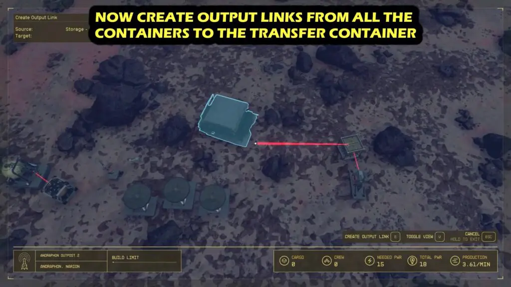 In Build Mode, position the cursor over the extractor, then select ‘Create Output Link’ (RT on Xbox, right-click on PC). Connect the line to the Transfer Container, ensuring a reliable connection between the two devices. This will initiate the harvesting or mining process, seamlessly transferring all collected materials to the storage of the Outpost.