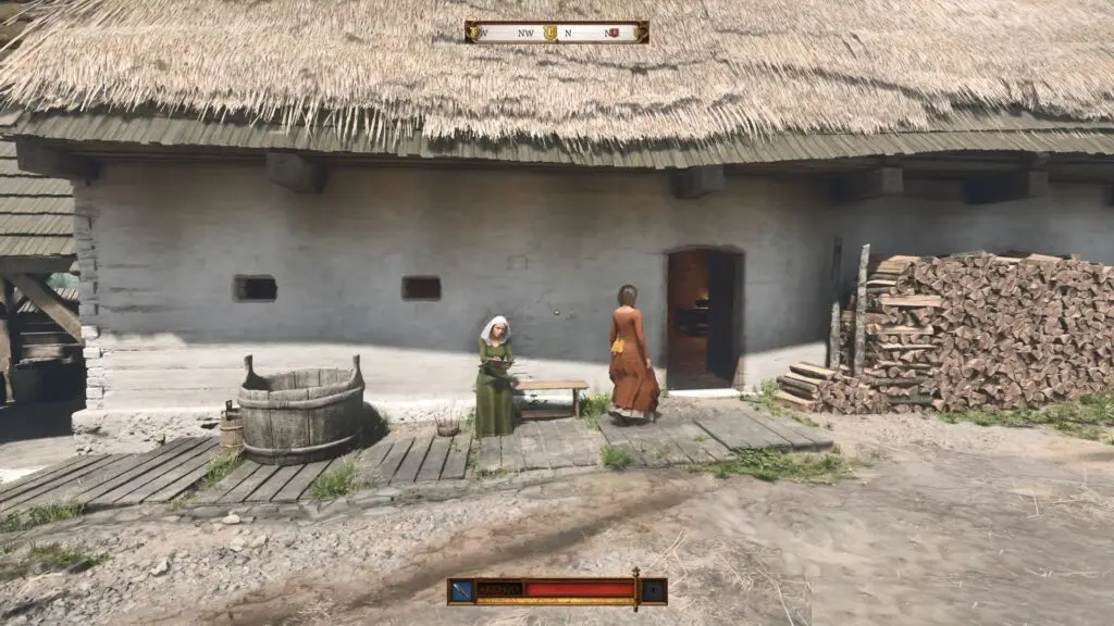 Head to Zhelejov Wagoners’ Inn, located northeast of Bozhena’s hut. Talk to the Old Woman named Dorothy. She is the owner of the bathhouse, and you can find her sitting outside.