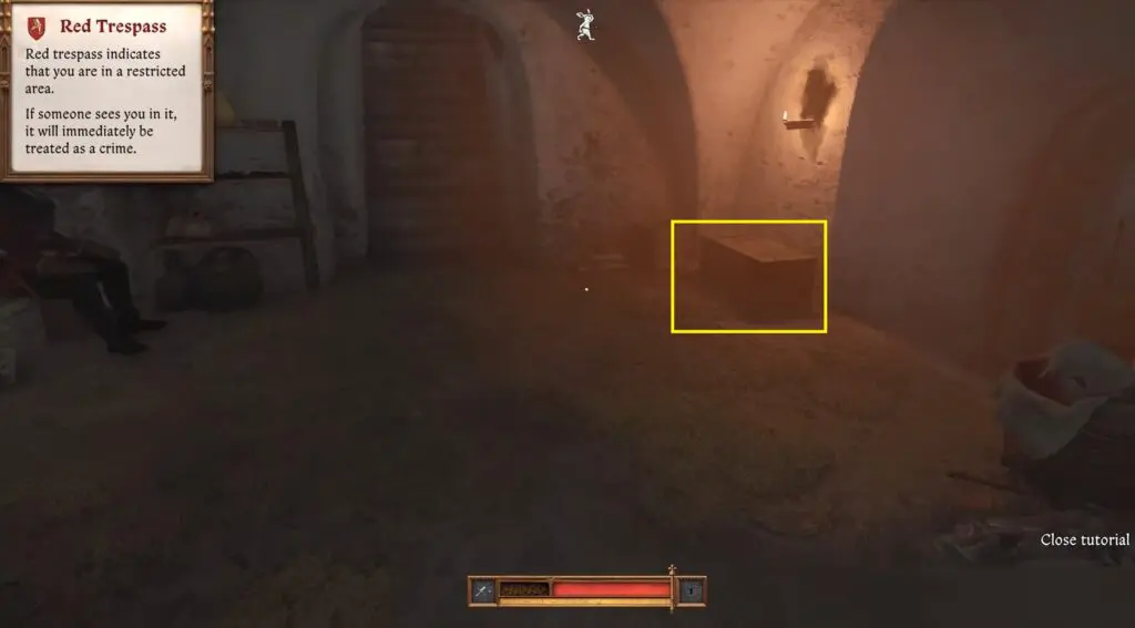 Downstairs, use the key to unlock the wooden chest near a sleeping guard to retrieve the documents.