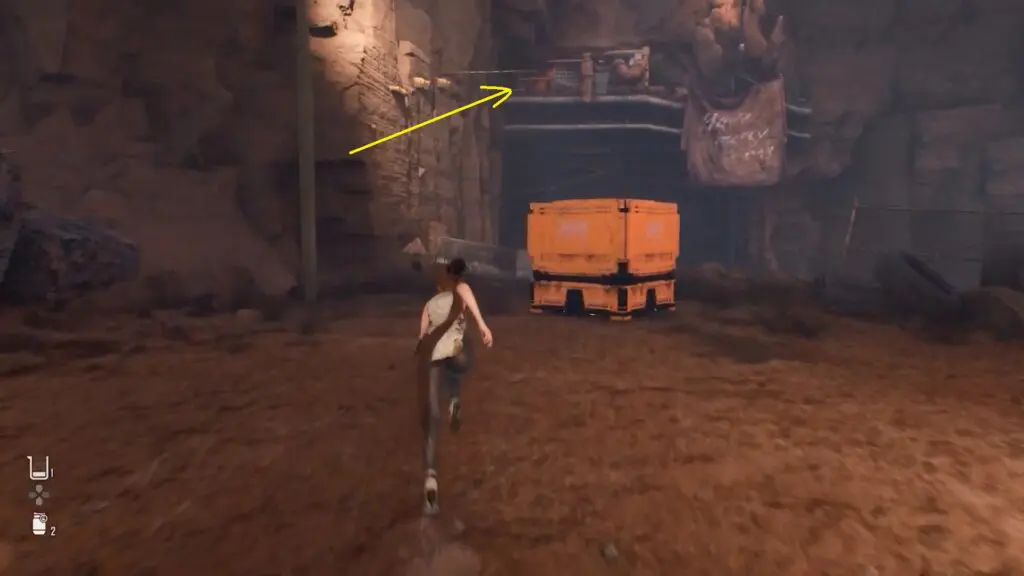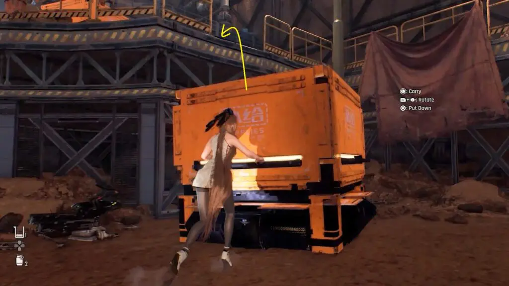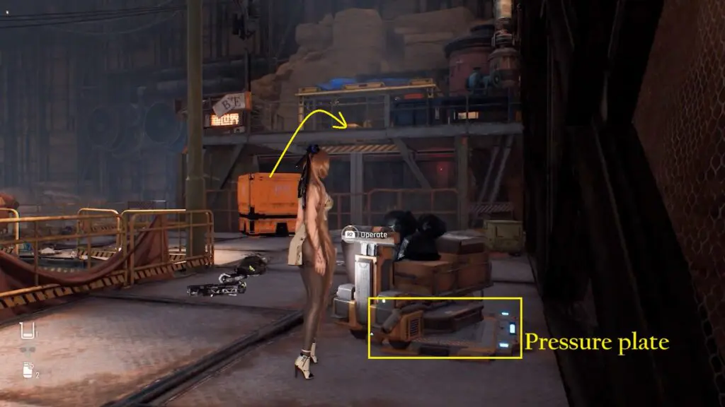 The buzzer is the objective marker located on the southern side. Push the yellow box and climb it to reach the 1st level of the platform.