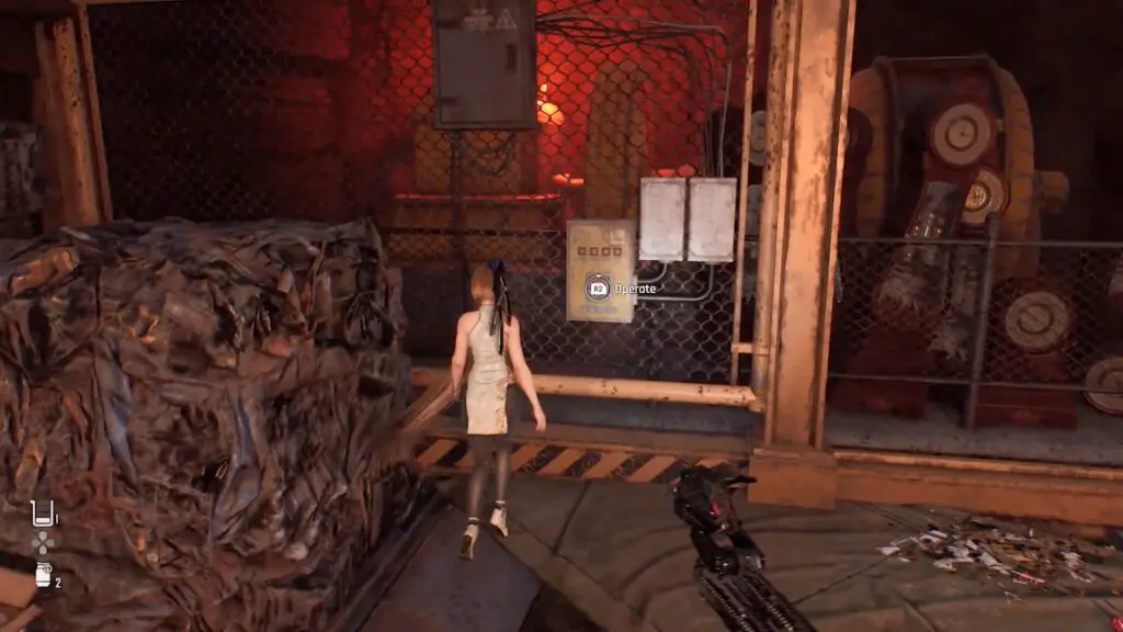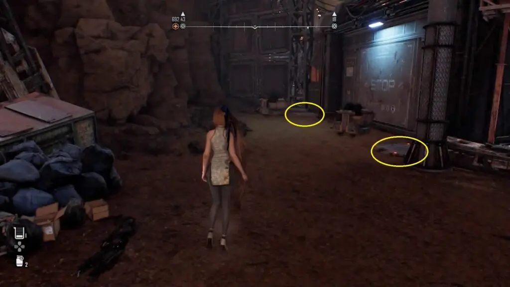 It is located on the easternmost side of the scrap yard as shown on the map. Push the yellow box forward and use the handholds and poles to reach the platform. Interact with the Ticker.