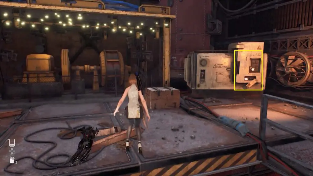 Push the smaller cart onto the nearby pressure plate to lower the gate. Then push the yellow box inside and climb up to the 2nd level. Interact with the Buzzer.