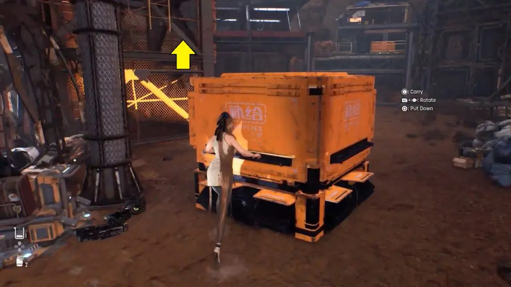 Then push the yellow box to the side of the tower so that you can climb it and reach the ladder. Climb up the tower and interact with the console to free up the robot.