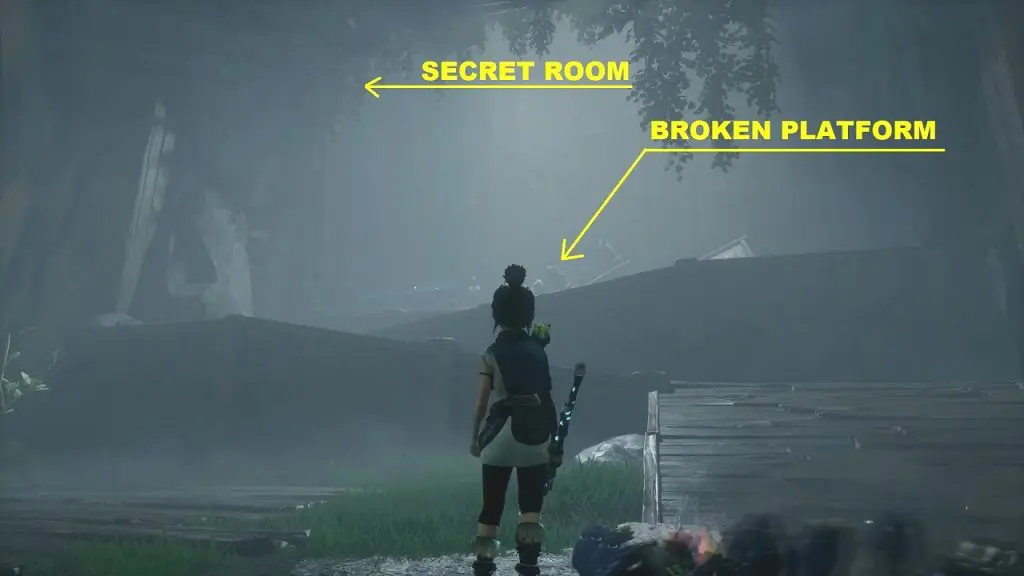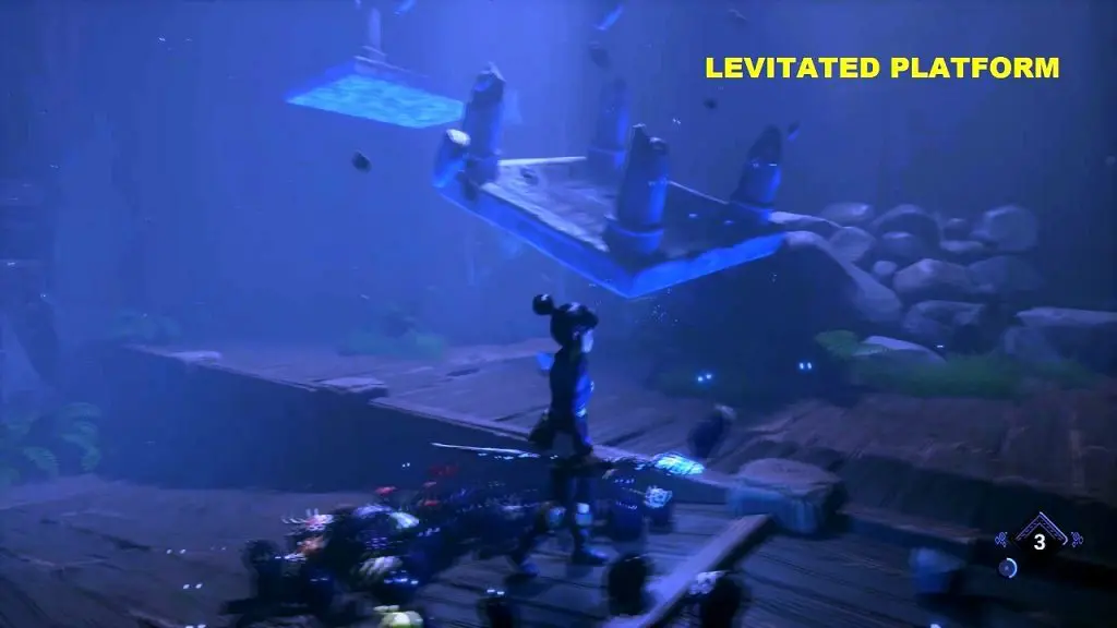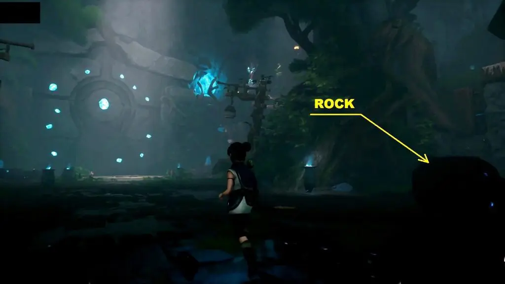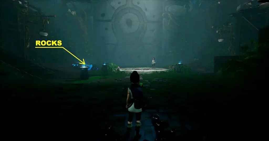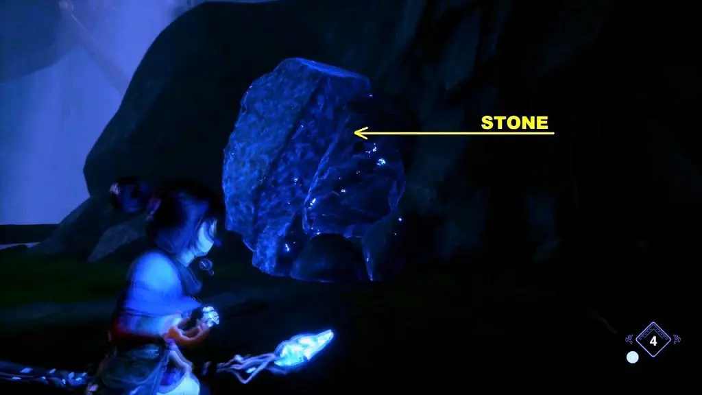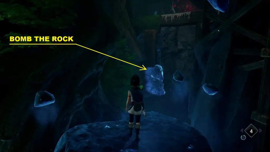 On the right side of the big door, you will find a few rocks as shown below. Throw a bomb on the rocks to make them levitate. Jump to the top of the levitated rocks. Please note that you cannot grab these rocks. You will have to double jump to reach the top of the floating rocks.