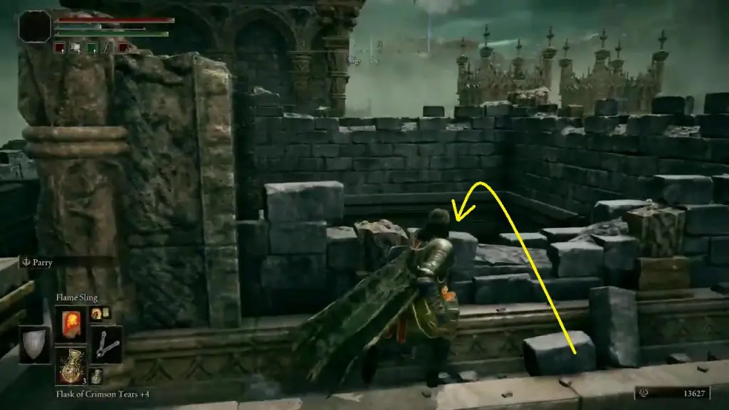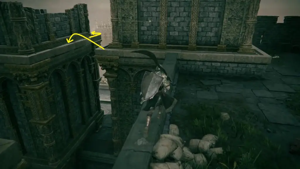 From the Rampart Tower Site of Grace, go through the door on the south side and climb up the stairs to reach the top level. Then proceed ahead to reach the terrace. Now go straight ahead and climb up the parapet wall on the east side of the terrace. Walk on the parapet wall and then jump on the ledge of the tower ahead as shown below.