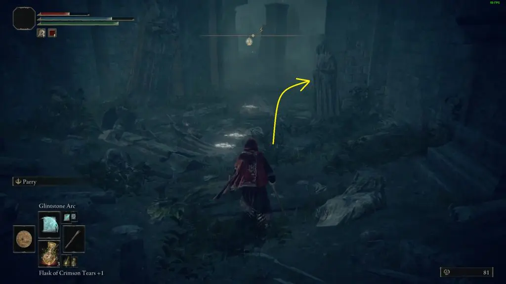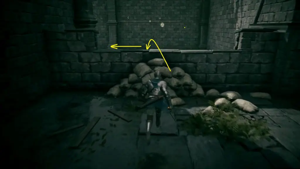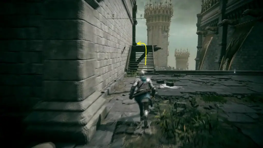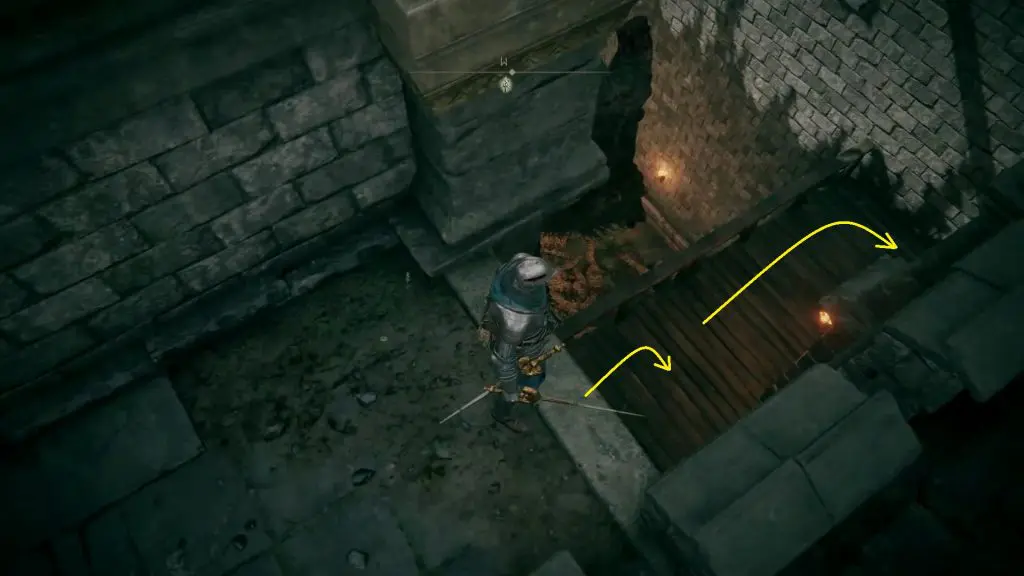 Move along this ledge. Then jump inside through the broken wall as shown below. Jump down to the lower level inside the tower. There you will find the Swordstone Key on a corpse as shown in the second picture below.