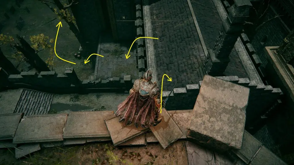 I will show the path to reach the gate lever from Rampart Tower Site of Grace. Click here to see how to reach the Rampart Tower. From the Rampart Tower Site of Grace, exit the room through the door on the north side of the room to reach the terrace. Then turn right and jump on the roof on the east side. The roof is a bit far. So, you will need to jump from the edge of the tile as shown in the picture below. From the roof, jump down on the north side to reach the courtyard. From there, go east as shown below.