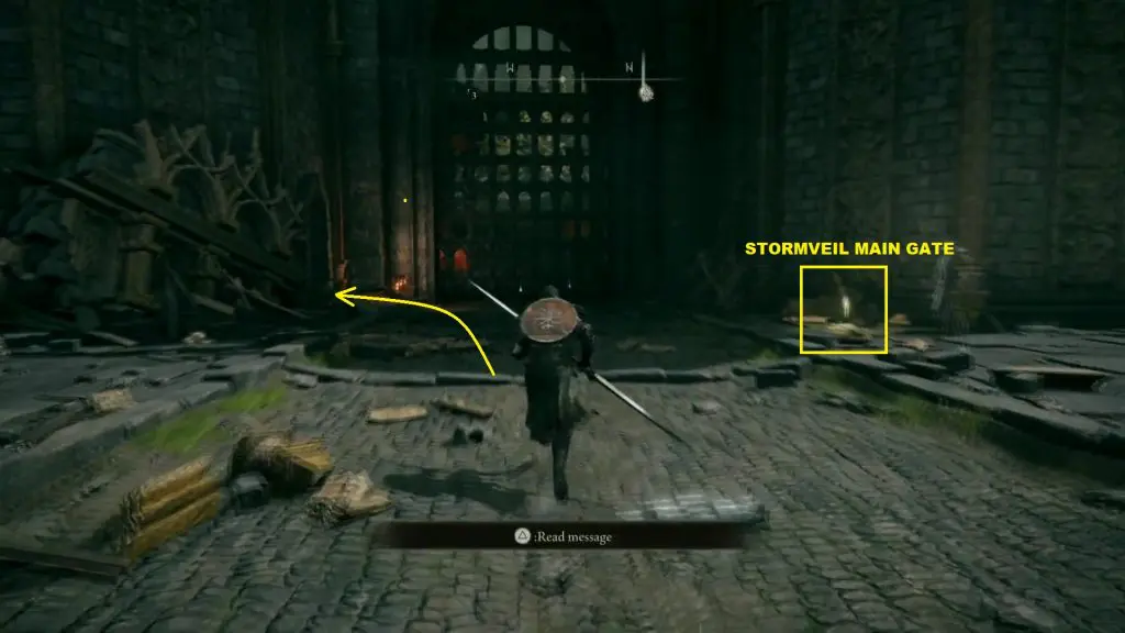 Path east from the courtyard will lead you to the main gate. On the right side of the main gate, you will find a room as shown in the picture below. In this room, there is a lever that opens the Stormveil castle main gate.