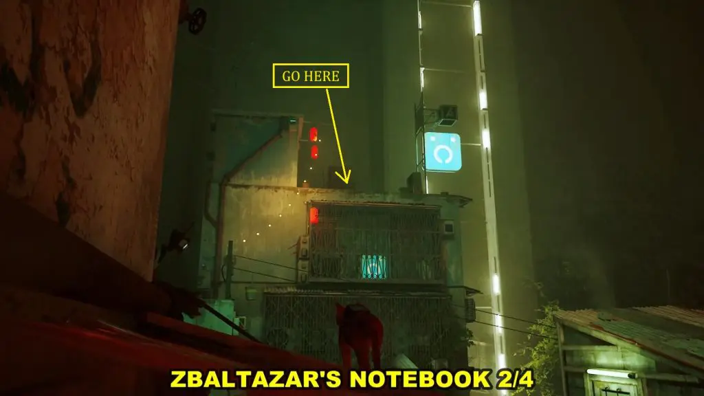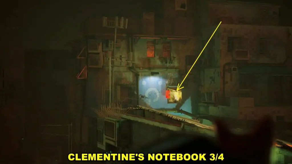 On the roof, disable the fan by removing the part as shown in the picture below. Then jump through the fan to enter the apartment. Knock over the boxes inside to get the notebook.