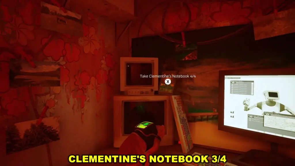 Clementine’s room is opposite Momo’s house, above Dufer Bar as shown in the picture below. Enter through the window and you will find the notebook sitting near a computer as shown in the second picture below.
