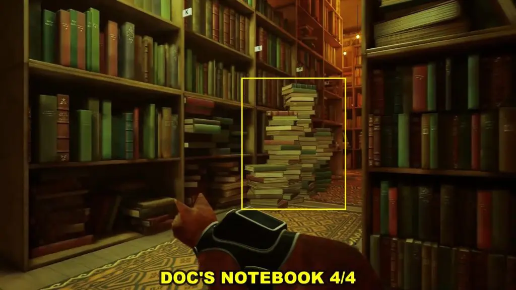 In the library, you will see some piles of books as shown below. Knock them over to reveal the safe behind them. Then use the keys to open the safe and get the Notebook.