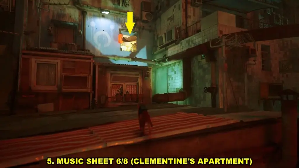 After coming out of Clementine’s Apartment, walk on the pipe to reach the balcony nearby as shown in the picture below. The Music Sheet is on a table on this balcony.