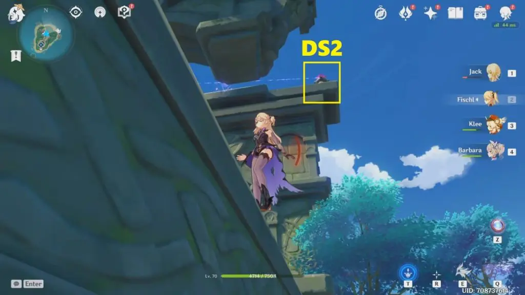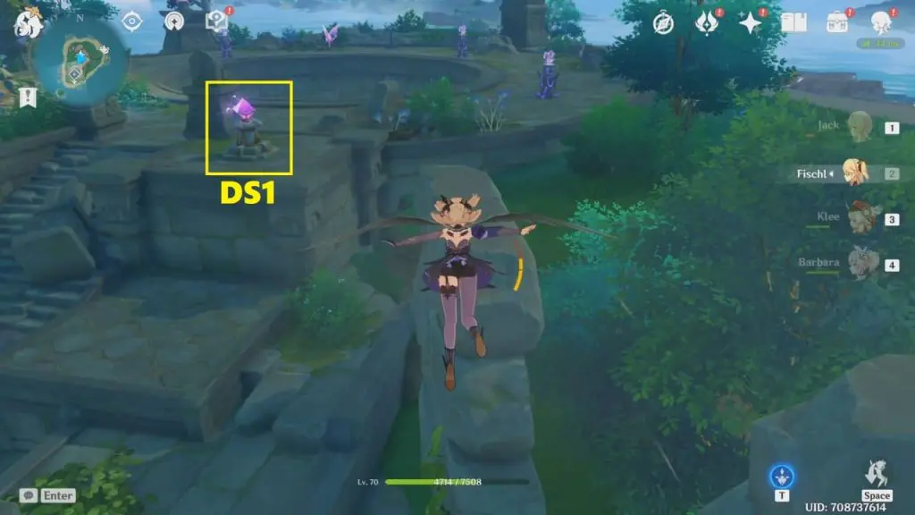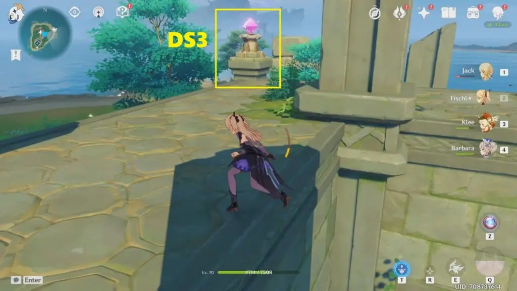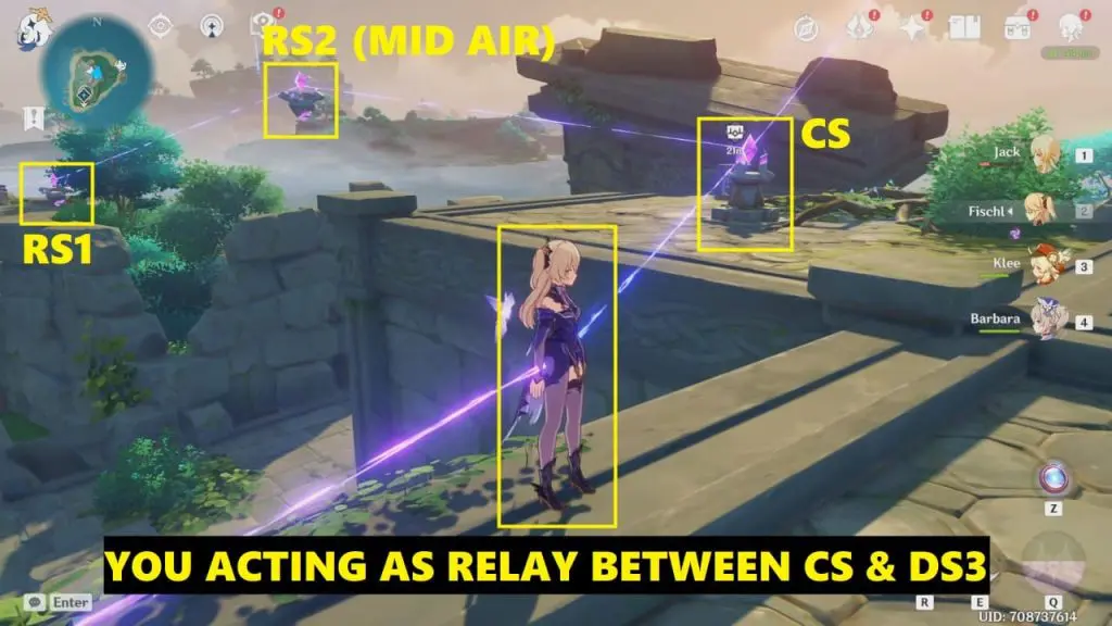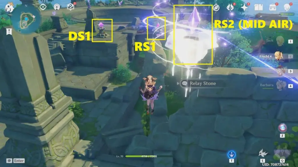 2 relay stones are needed to connect DS3 and CS but you only have one. So, you need to charge yourself with electro and act as a relay yourself. An electrogranum plant is on the left side of DS3. Jump down and summon an electrogranum (now you can act as a relay). Place the remaining relay stone and yourself (charged with electro) in between the DS3 and CS to connect them both. An exquisite chest will appear near the cumulation stone. Collect the loot!