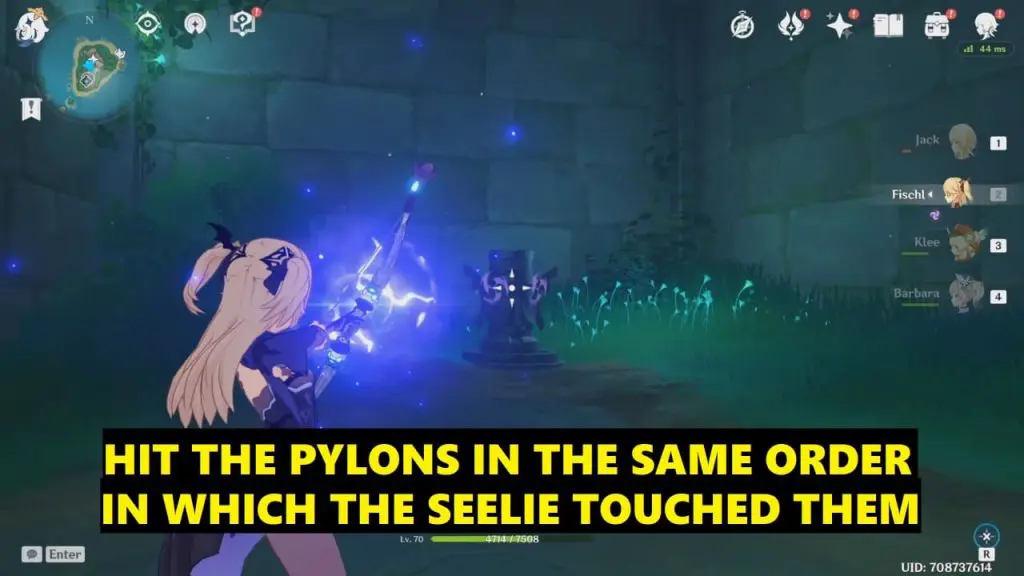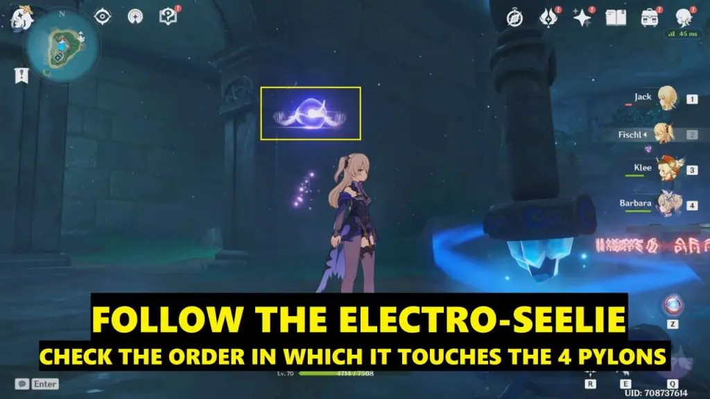 STEP 2 (Unlock the lightning probe): Interact with the statue which is to the right of the locked iron gate. An Electro-Seelie will appear. Follow the Electro-Seelie and note the order in which it touches the 4 Pylons in this area. The first 2 pylons are in the room in front of the statue. The door to this room can be opened by interacting with the switch on its right. Hit the 4 Pylons with electrical attacks in the same order in which the Electro-Seelie touched these Pylons. This will unlock the lightning probe.