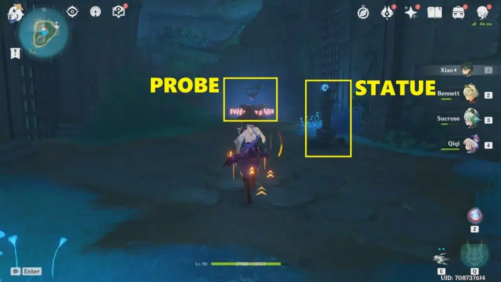 The Lightning Strike Probe has a compass attached to the top that points towards players or enemies charged with electro element. On the base of the Lightning Strike Probe, there is a protruding edge representing the direction in which the compass needs to be pointed (See the picture below). Use electro element to make the compass point in the correct direction and this will make the device glow, as shown in the second picture below.
