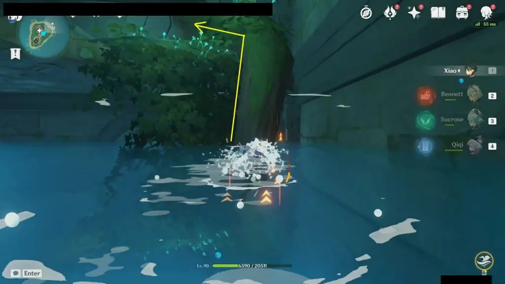 After the water is lowered halfway, dive down the pool and swim in the opposite direction of the domain entrance. Swim inside the submerged tunnel until you reach a tree going to the upper floor as shown in the picture below. Climb on the tree to go to the upper floor.