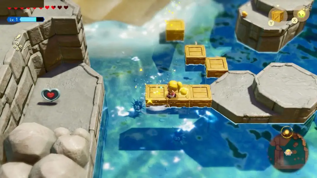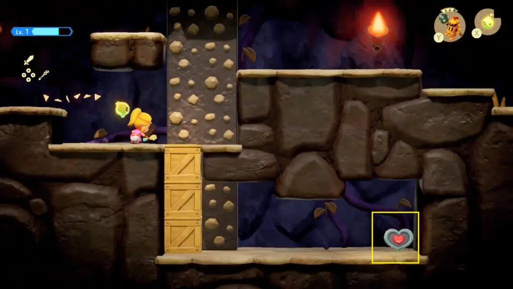 The first Heart Piece can be found on a ledge in the southeastern area of Southern Beach. Players can climb up to it by using old beds and boxes.