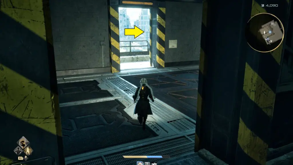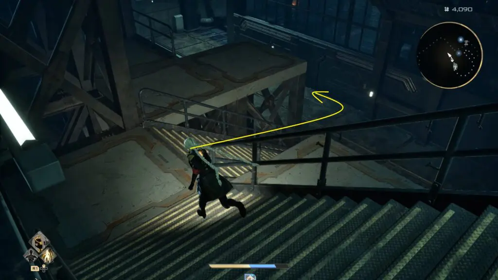 After exiting the elevator, enter the room on the left and climb the stairs leading upward. From there, move onto the balcony and walk to the opposite end.