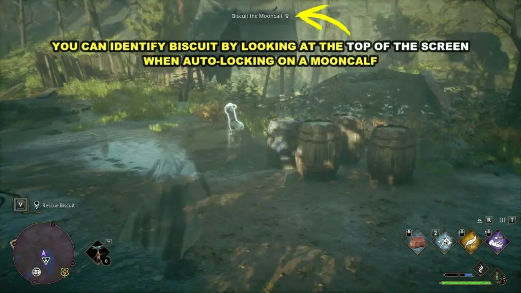 Now that all the mooncalves are free, you have to catch Biscuit. Biscuit is a White Female Mooncalf. Use the Disillusionment spell to get close to the mooncalves. You can identify Biscuit by looking at the top of the screen when auto-locking on a mooncalf as shown in the picture below. Now go near Biscuit and use your Nab-Sack to catch it. This will complete the objective.