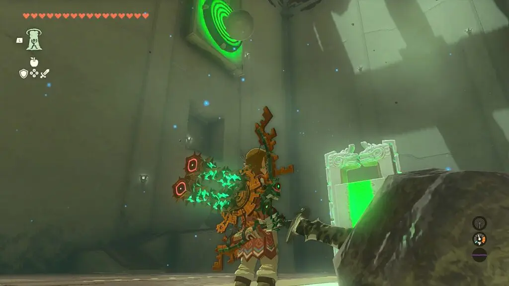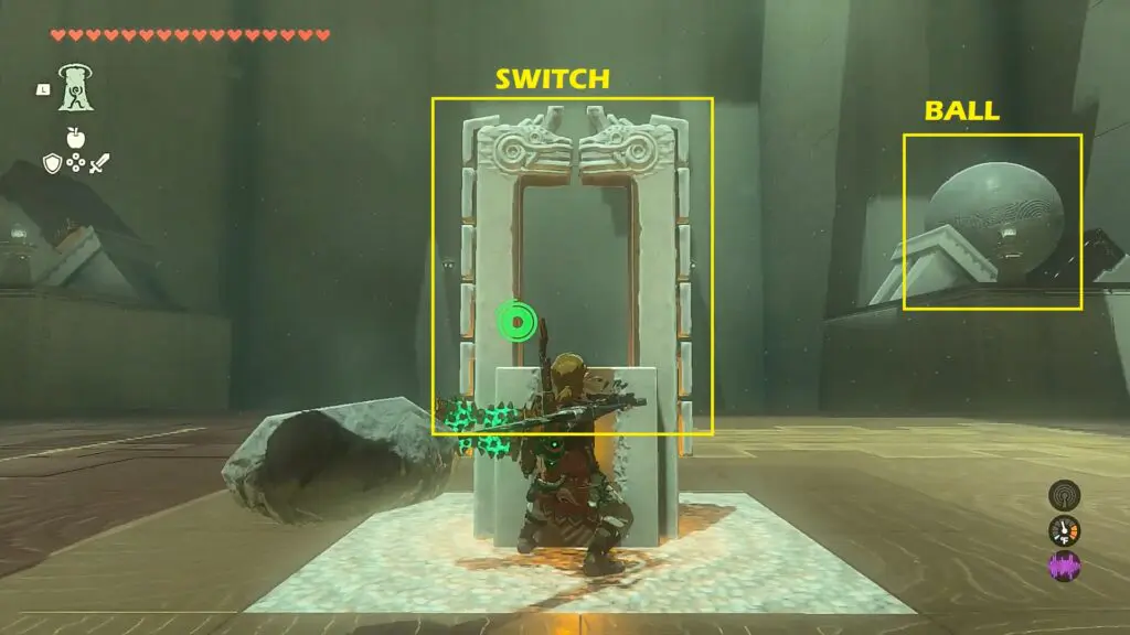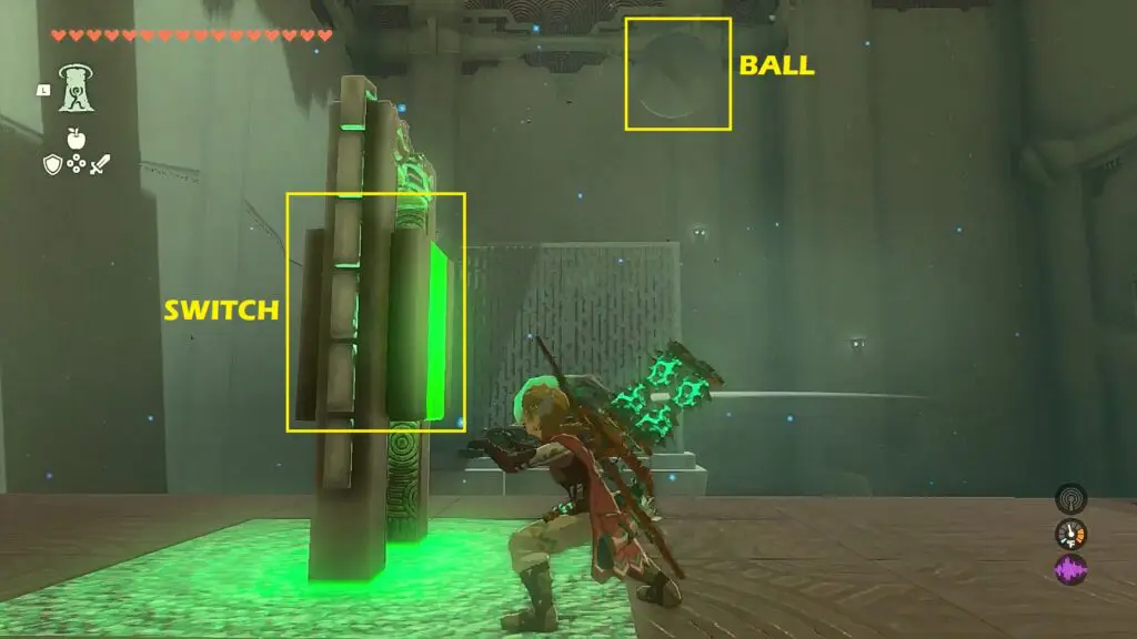 As you enter the shrine, you will notice two balls being pushed back and forth between the two tilted platforms. When the ball is on the right platform as shown in the picture below, hit the gravity switch as shown in the picture below. This will disable the gravity and the ball will go and hit the switch on the left wall as shown in the second picture below. This will open the iron gate on the right wall.