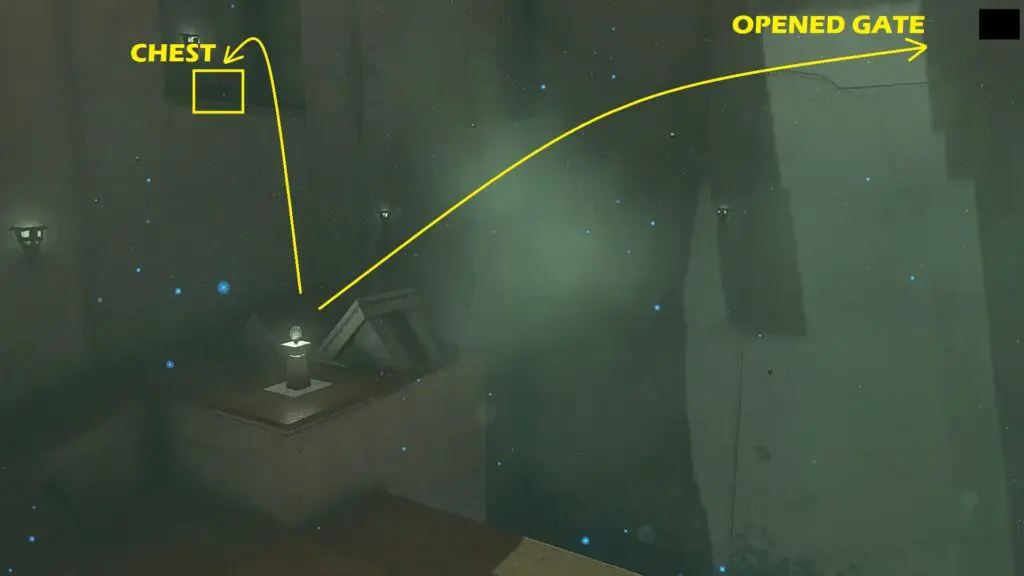 Now go to the left platform as shown in the picture below. Stand there and when the platform throws you, glide to the platform with the chest. Open the chest to get a Large Zonai Charge. Now jump down and stand on the left platform ahead. When the platform throws you, go through the gate that you opened before as shown in the picture below.