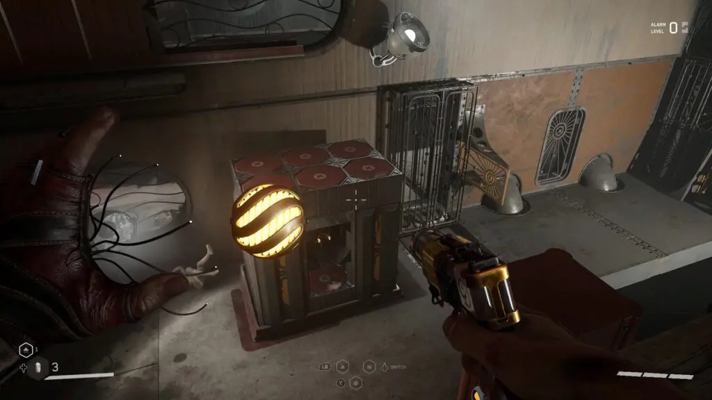 Proceed ahead and you will reach a puzzle room. Rotate the red wheel there and a set of magnetic coils will appear as shown in the picture below. Use shock on the magnetic coils and a platform will move up. Then move the red wheel again and another set of magnetic coils will appear as shown in the second picture below. Use shock on the magnetic coils and another platform will move up. Use the platform to cross to the other side. Then open the puzzle door and proceed ahead to reach the bronze chest. Open it to get the KS-23 – Thermal Scope blueprint.