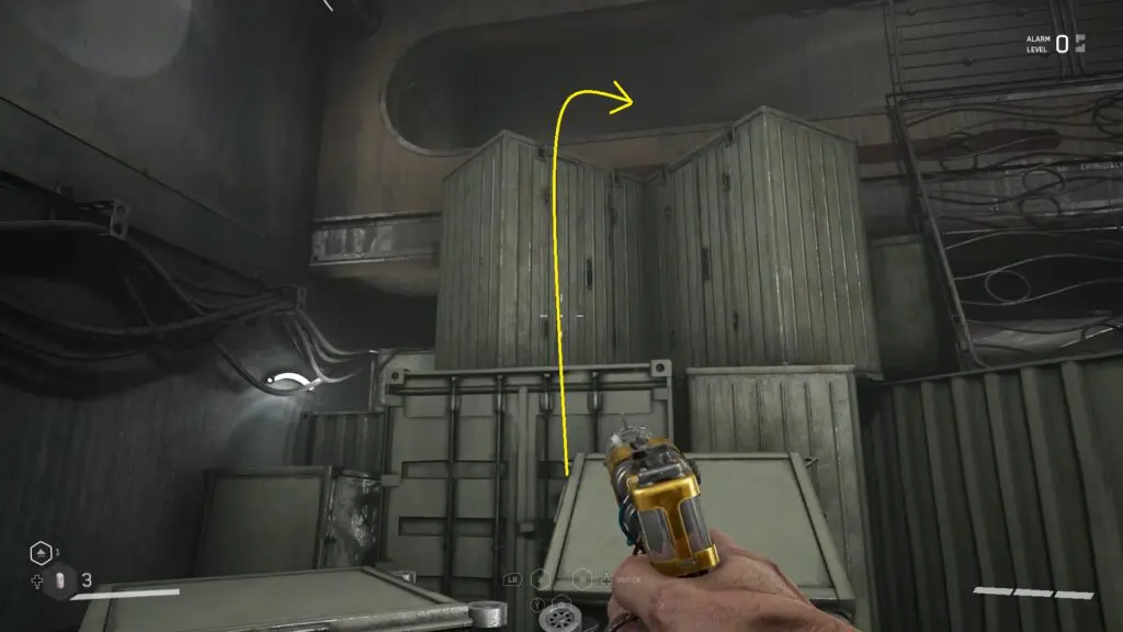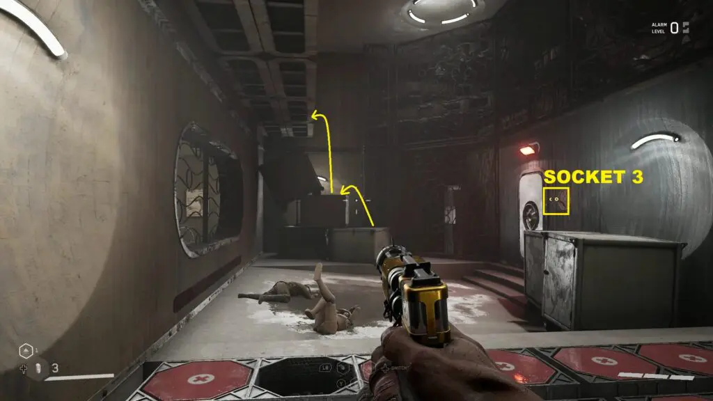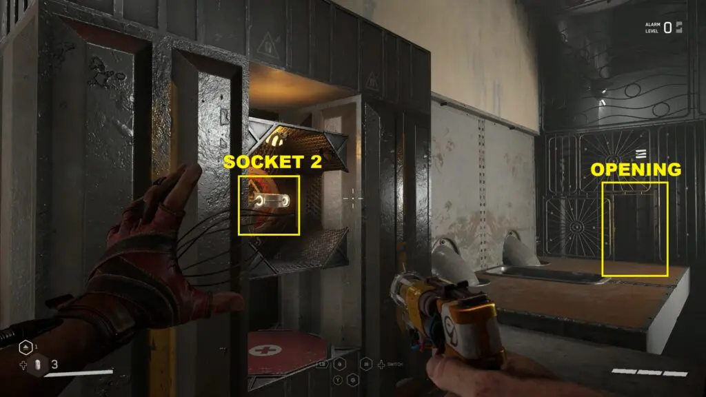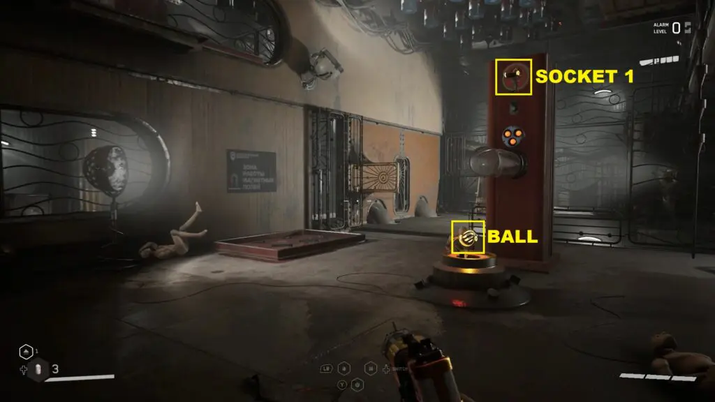 Insert the ball into socket 1. Now use shock on the roof. This will make the magnetic wall in front of the opening go down, clearing your path. Go through the opening and climb up the boxes on the right side to reach the upper level as shown in the picture below. Then open the magnetic gate there as shown in the second picture below.