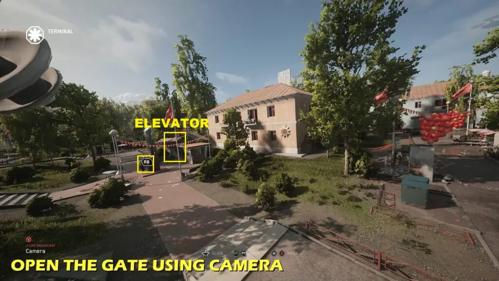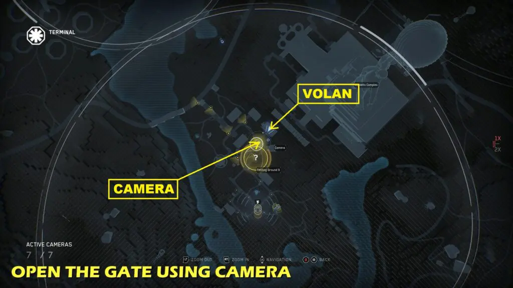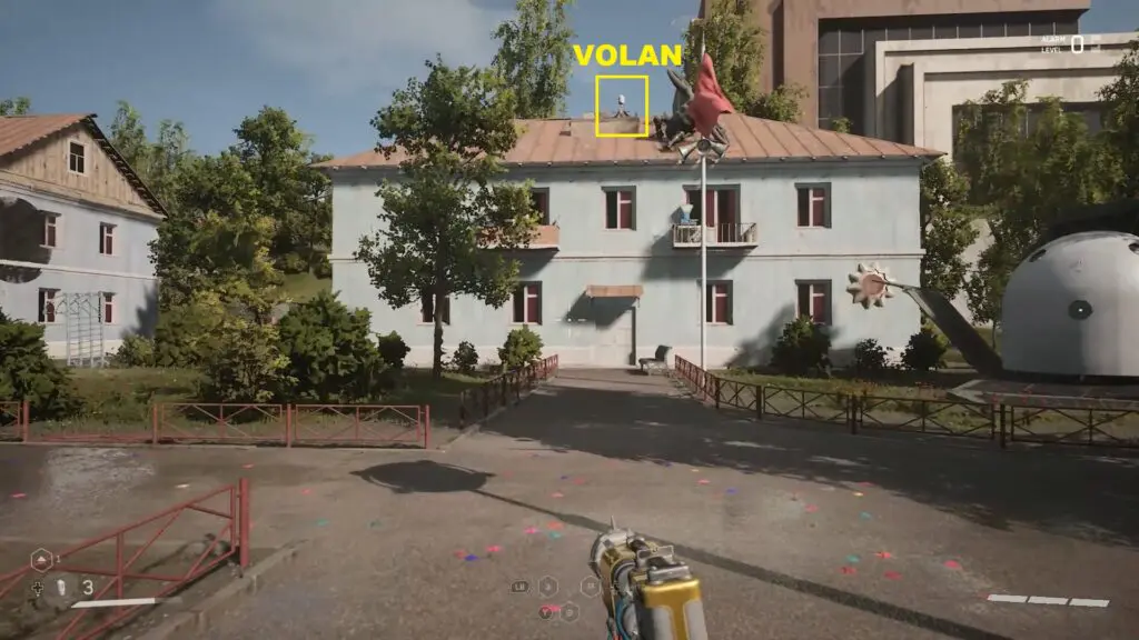The Volan is on the roof of a house as shown in the pictures below. Climb to the roof using crates and pipe and the side of the house. Interact with the Volan and use the camera to open the elevator door as shown in the pictures below. Take the elevator down to reach the Testing Ground.